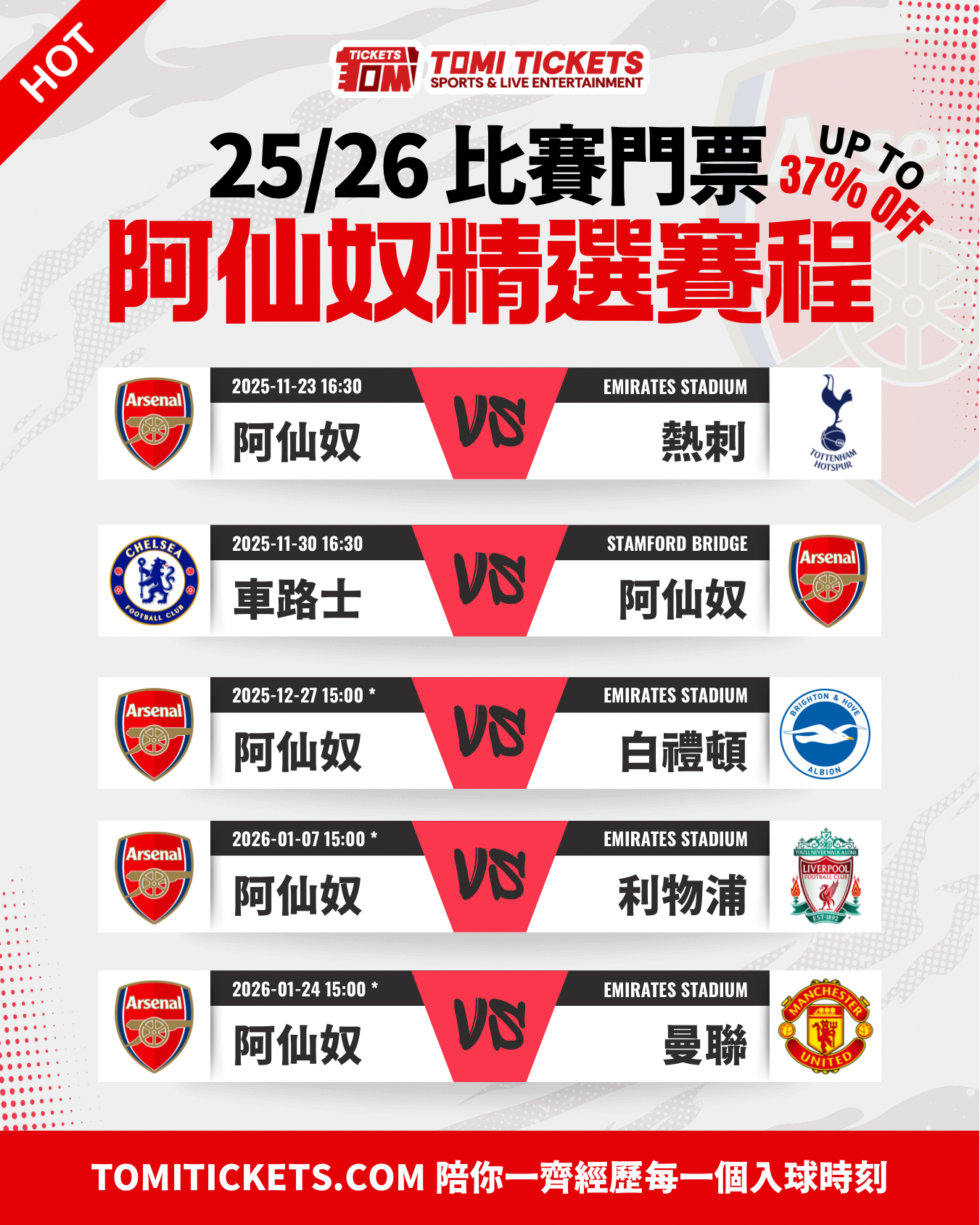 阿仙奴(阿森納/兵工廠/Arsenal)25/26 精選賽程門票|英超爭冠熱門