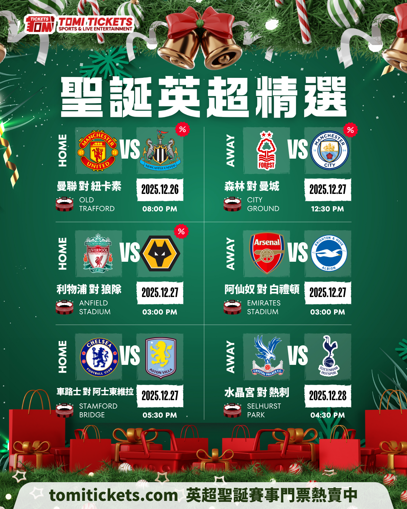 曼聯對紐卡素|諾定咸森林對曼城|利物浦對狼隊|阿仙奴對白禮頓|車路士對阿士東維拉|水晶宮對熱刺。全球華語可購,電子票 + 連座 + VIP/Hospitality。